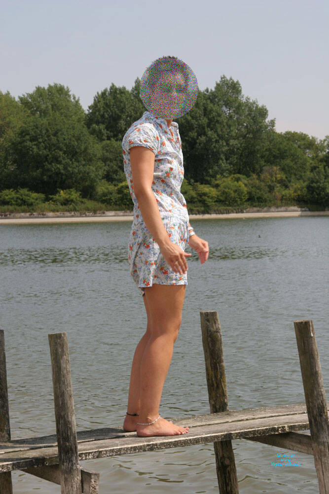 This is another Sunday walk outing with me wearing just my blue summer dress and barefoot all day. For this adventure we chose a local lake that is very popular and is also full of wildlife with a bird hide. I left home in just my dress with no shoes and bare feet and was like that all day. I love being barefoot and Mike loves my feet so we were both happy. We parked the car and started our walk, it wasn't long before we came to the lake with an old rickety boat launch platform. An ideal and very public place to start the fun. Mike got the camera going as I stood on the platform and started to undo my buttons, him keeping an eye out for walkers one way and me the other. Once it was fully unbuttoned I lay down on the deck so he could photograph me in the lovely warm sunshine. I fastened some of the buttons as we carried on with our walk, only so that I could tease him by undoing them again. Once they were unbuttoned for the second time though they stayed like that the rest of the walk. I love having an all over tan and feeling the sun on my body. I didn't take the dress completely off as there were lots of walkers and I had to keep pulling it across my body as we walked by others. They must have had a good idea what we were doing though as Mike had his camera and I was holding my unbuttoned dress across my barefoot body as we walked past. I've been asked for more photos of my feet and bum so have included some here for you. I love reading your comments so let me know what you think to my latest outing x Eve