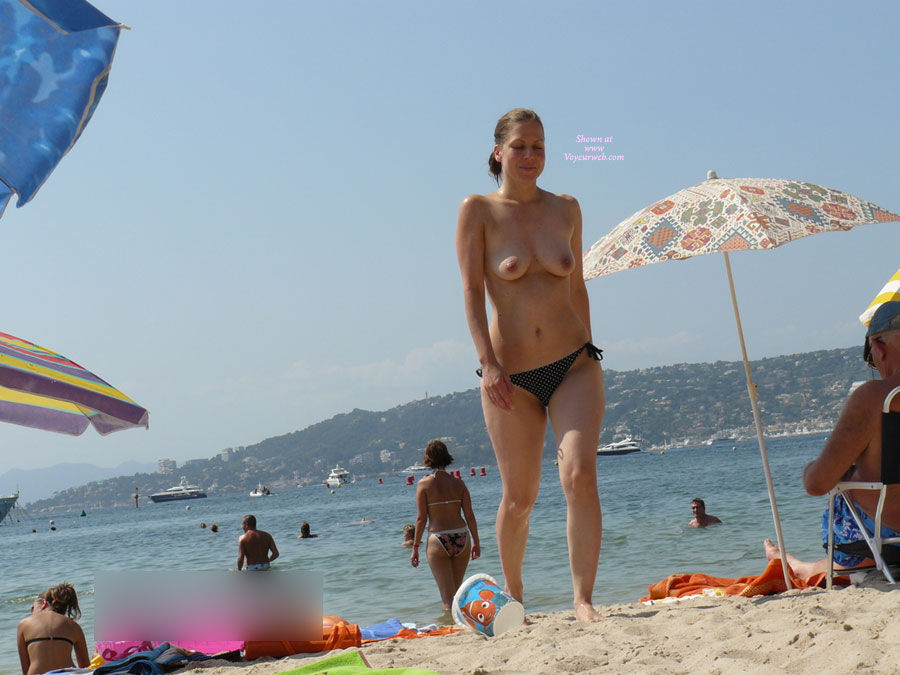 A [[topless]topless] beach cutie on a public Juan les Pins beach this summer.